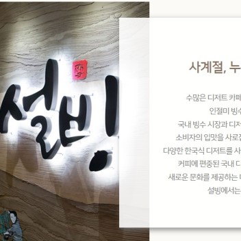 코리안디저트카페 브랜드 설빙은 전국 460여개의 점포를 보유한 프랜차이즈 디저트카페 입니다