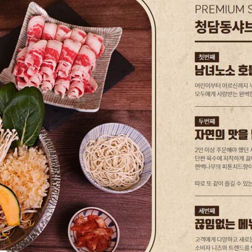 남녀노소 호불호 없는 메뉴 어린이부터 어르신까지 누구나 즐길 수 있는 맛 모두에게 사랑받는 완벽한 한 끼, 자연의 맛을 담은 특별한 1인상, 2인상 주문해야 했던 샤브, 단짠 육수에 자작하게 끓여 노른자에 찍어 먹는 관서식 스키야키, 편백나무의 피튼치드향이 가득한 편백찜까지, 따로 또 같이 즐길 수 있는 1인상으로 제공