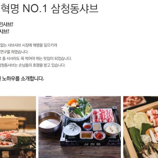싱서운 맛과 식상하고 오랜 시간 노력과 연구를 하였습니다. 예상은 적중, 오픈과 동시에 바로 줄 서서라도 꼭 먹어야 하는 맛집이 되었습니다. 맛과 멋 그리고 건강까지 잡은 삼청동샤브라는 손님들의 호평을 받고 있습니다.