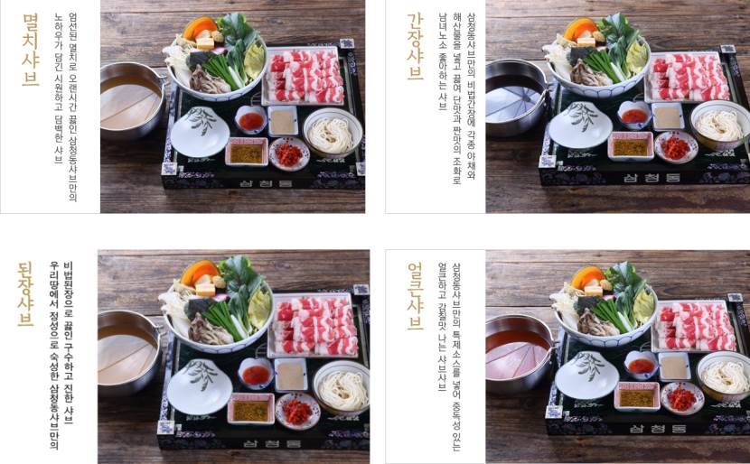 삼청동샤브는 기본에 충실합니다. 삼청동샤브의 모든 육수는 엄선된 멸치로 오랜시간 끓이는 멸치육수를 사용합니다. 삼청동샤브만의 비법간장소스와 특제소스를 개발하여 보다 깊은 맛을 제공합니다. 삼청동샤브는 신선한 야채와 건강한 재료로 정성을 담아 요리합니다.
